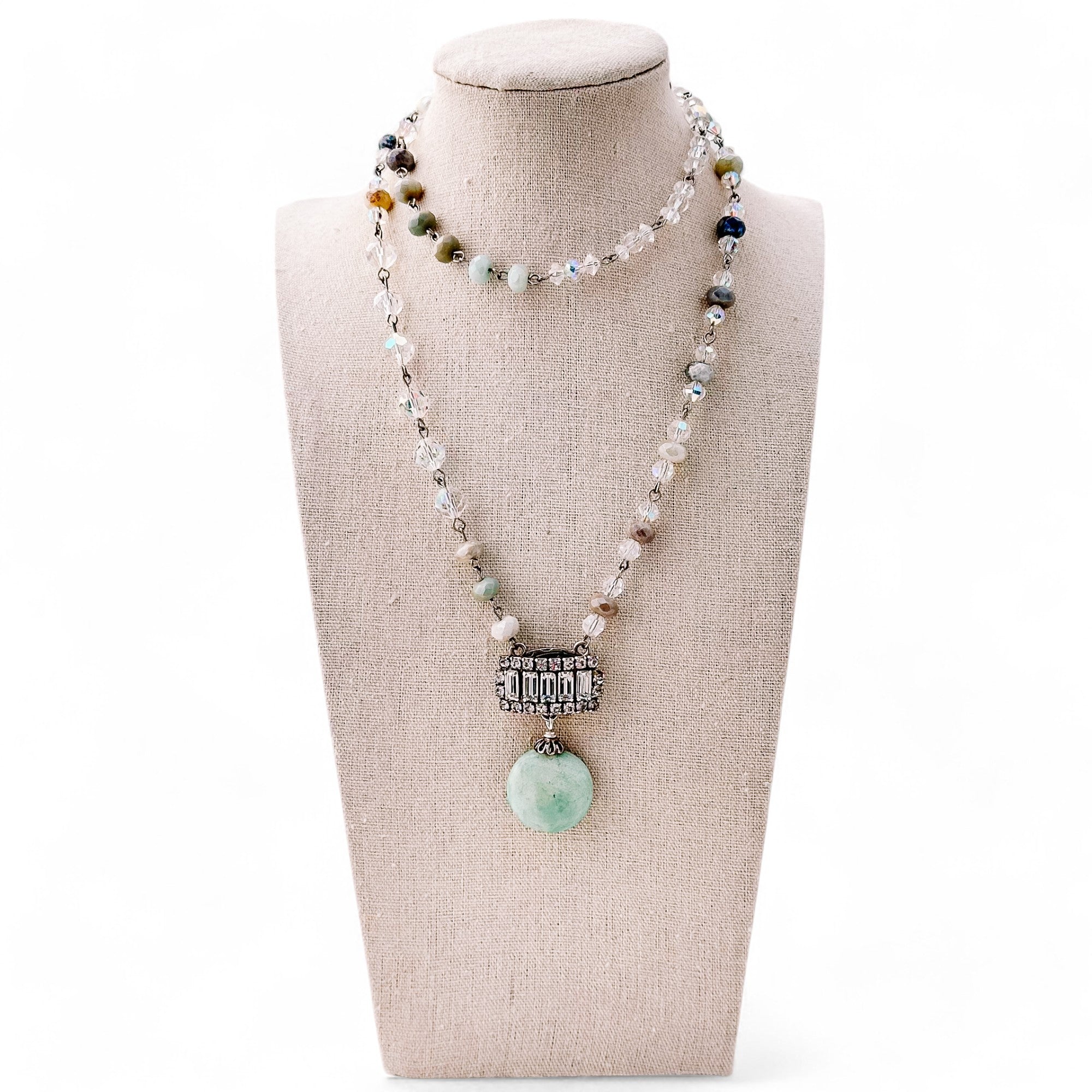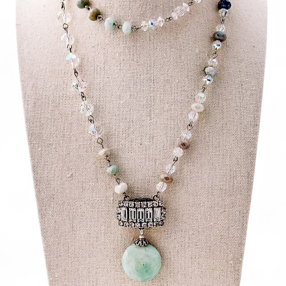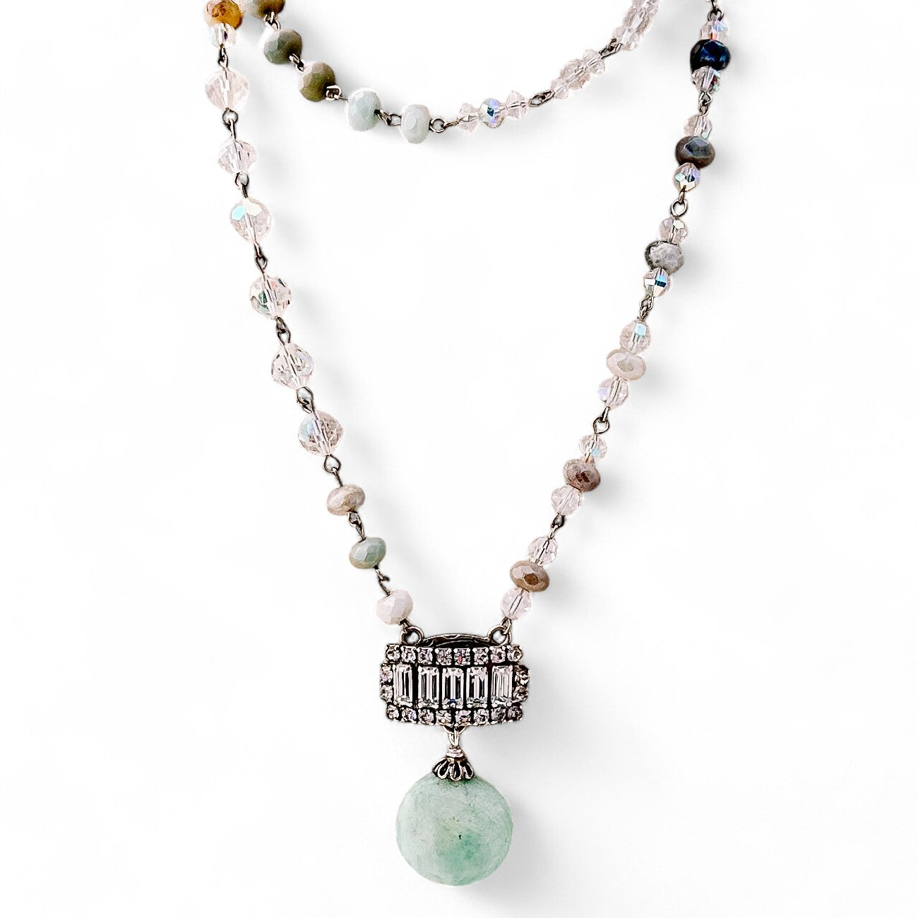 This rosary-style necklace comprises beautiful hand-wrapped vintage ab crystal and amazonite gemstone beads with an upcycled vintage rhinstone focal pendant.