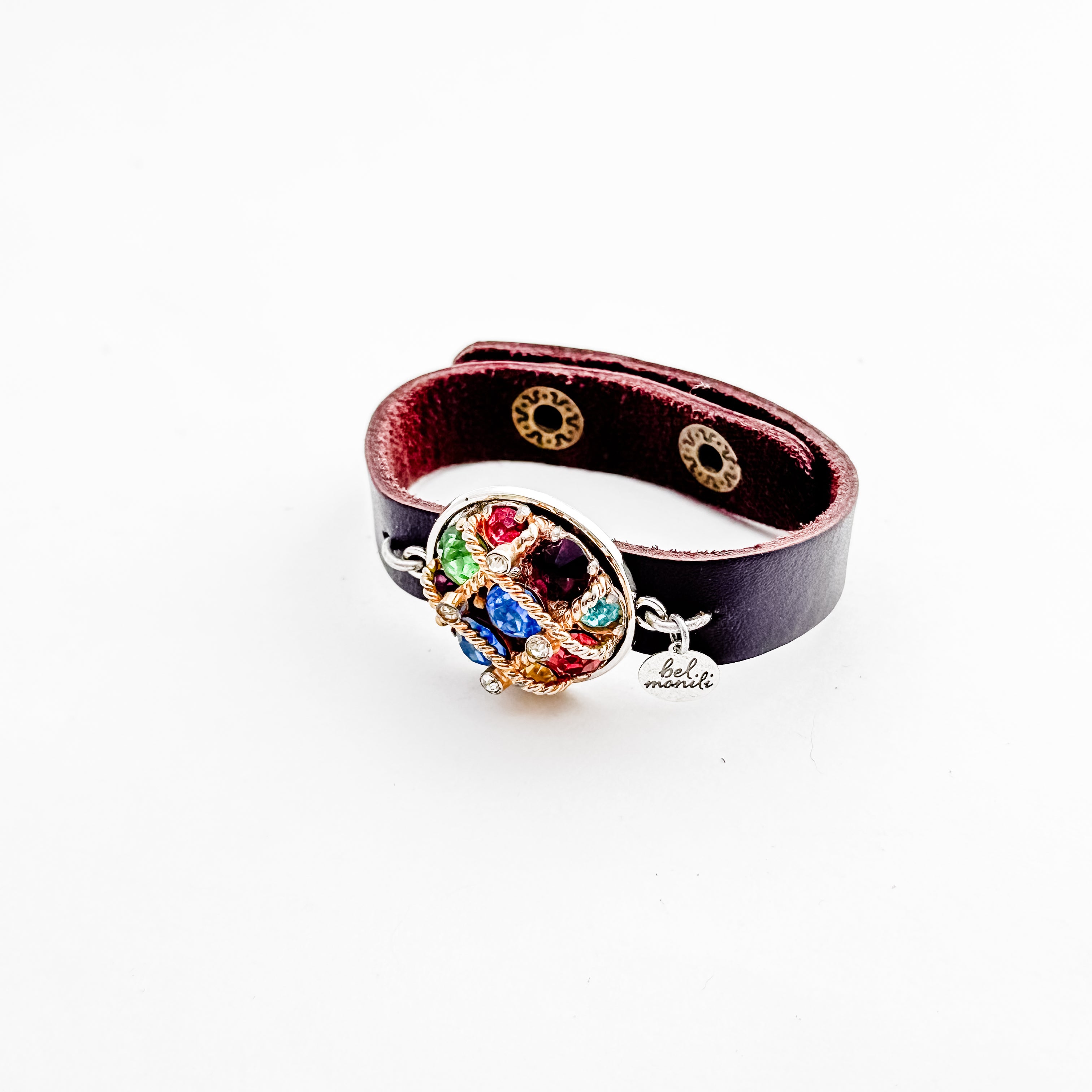 Rainbow rhinestone vintage bauble leather cuff bracelet