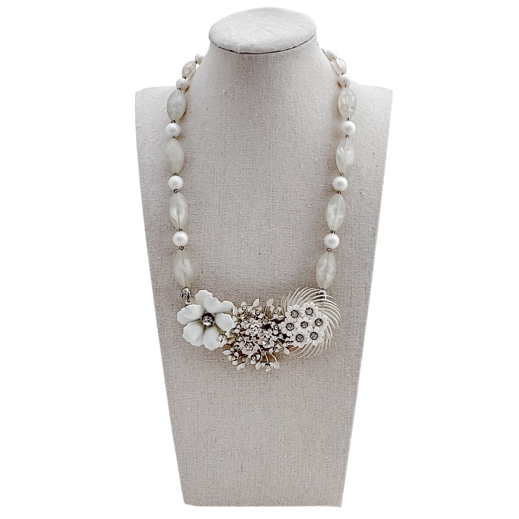 Here is one of my bel monili signature collage necklaces: a statement necklace that combines repurposed vintage costume jewelry components as the focal paired with hand-strung frosted clear vintage resin beads.