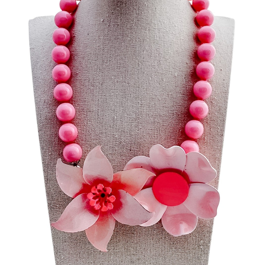 Here is one of my bel monili signature collage necklaces: a statement necklace that combines repurposed vintage costume jewelry components as the focal paired with hand-wrapped bubblegum pink glass beads.