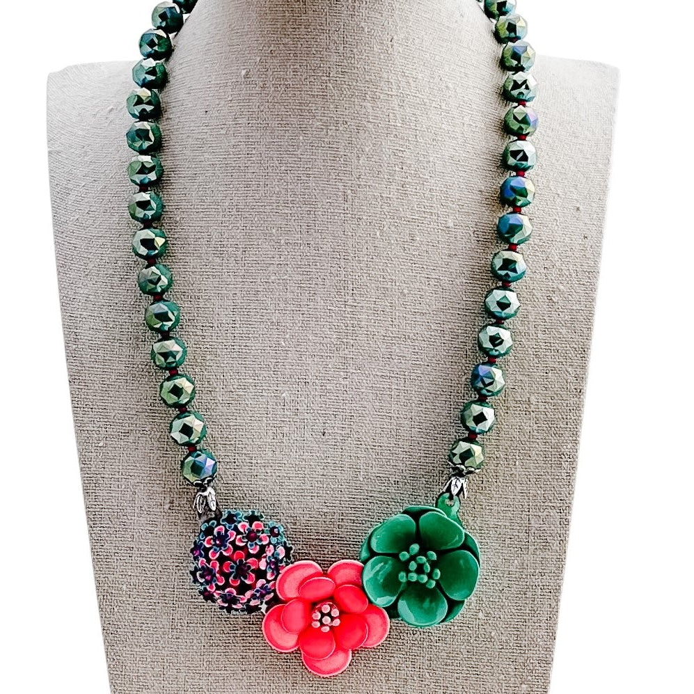 Here is one of my bel monili signature collage necklaces: a statement necklace that combines repurposed vintage costume jewelry components as the focal paired with hand-wrapped iridescent teal glass beads.