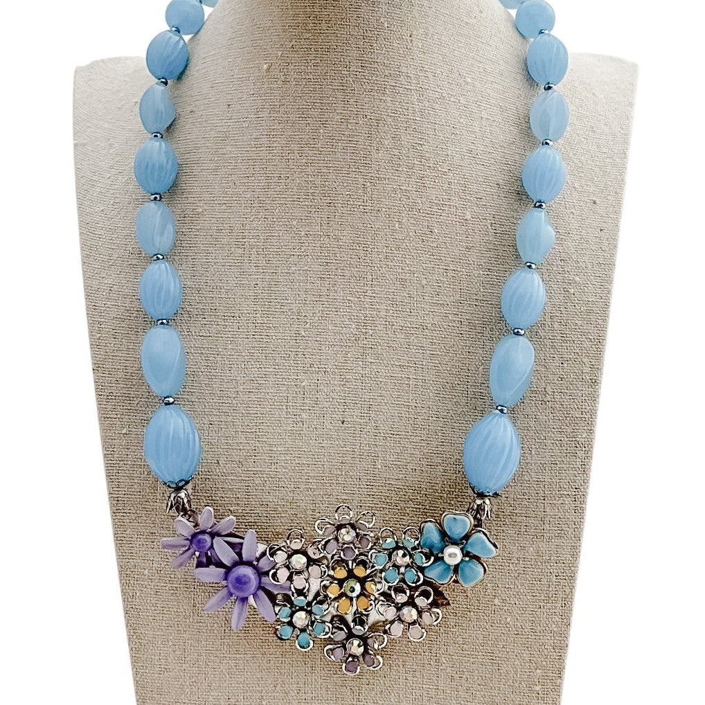Here is one of my bel monili signature collage necklaces: a statement necklace that combines repurposed vintage costume jewelry components as the focal paired with hand-strung vintage beads.