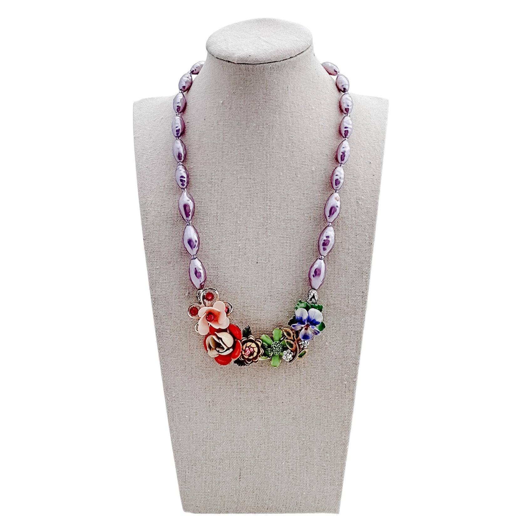 Here is one of my bel monili signature collage necklaces: a statement necklace that combines repurposed vintage costume jewelry components as the focal paired with hand-strung vintage lilac resin beads.