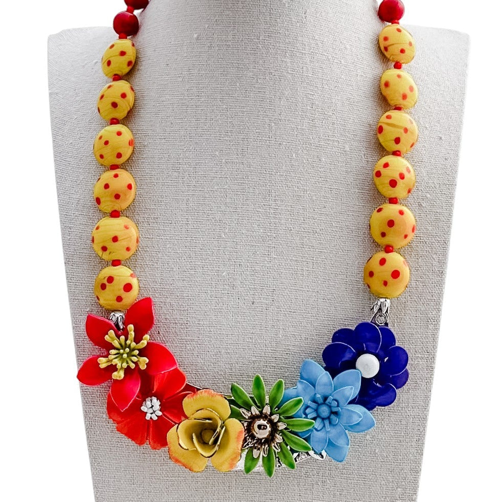 Here is one of my bel monili signature collage necklaces: a statement necklace that combines repurposed vintage costume jewelry components as the focal paired with hand-wrapped glass beads.
