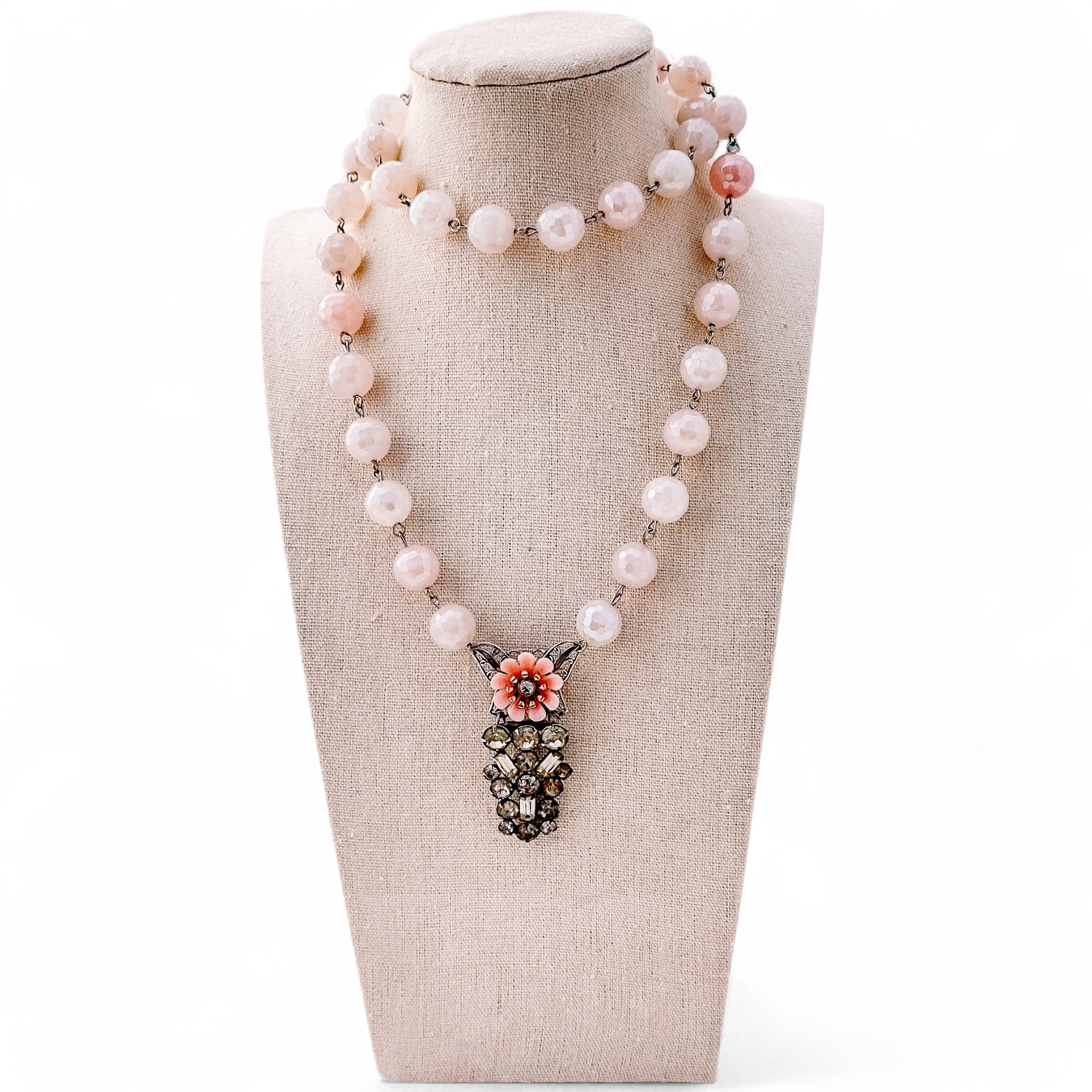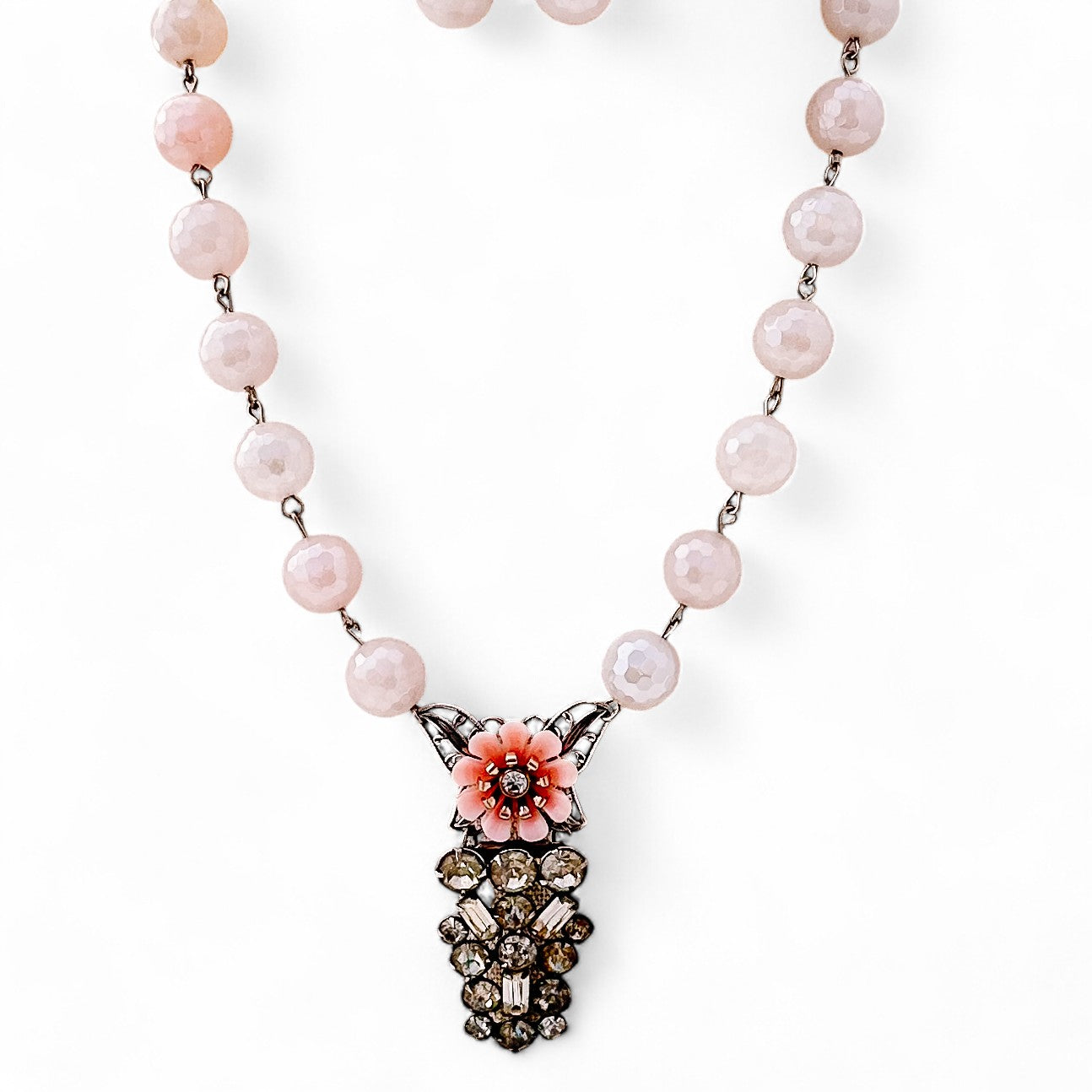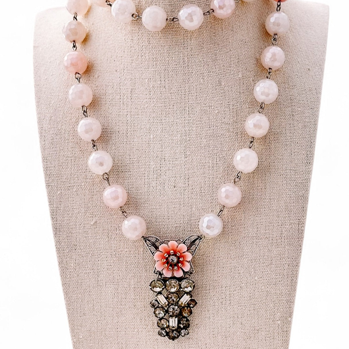 This rosary-style necklace comprises beautiful hand-wrapped iridescent pink jade gemstone beads with an upcycled vintage rhinstone focal pendant.