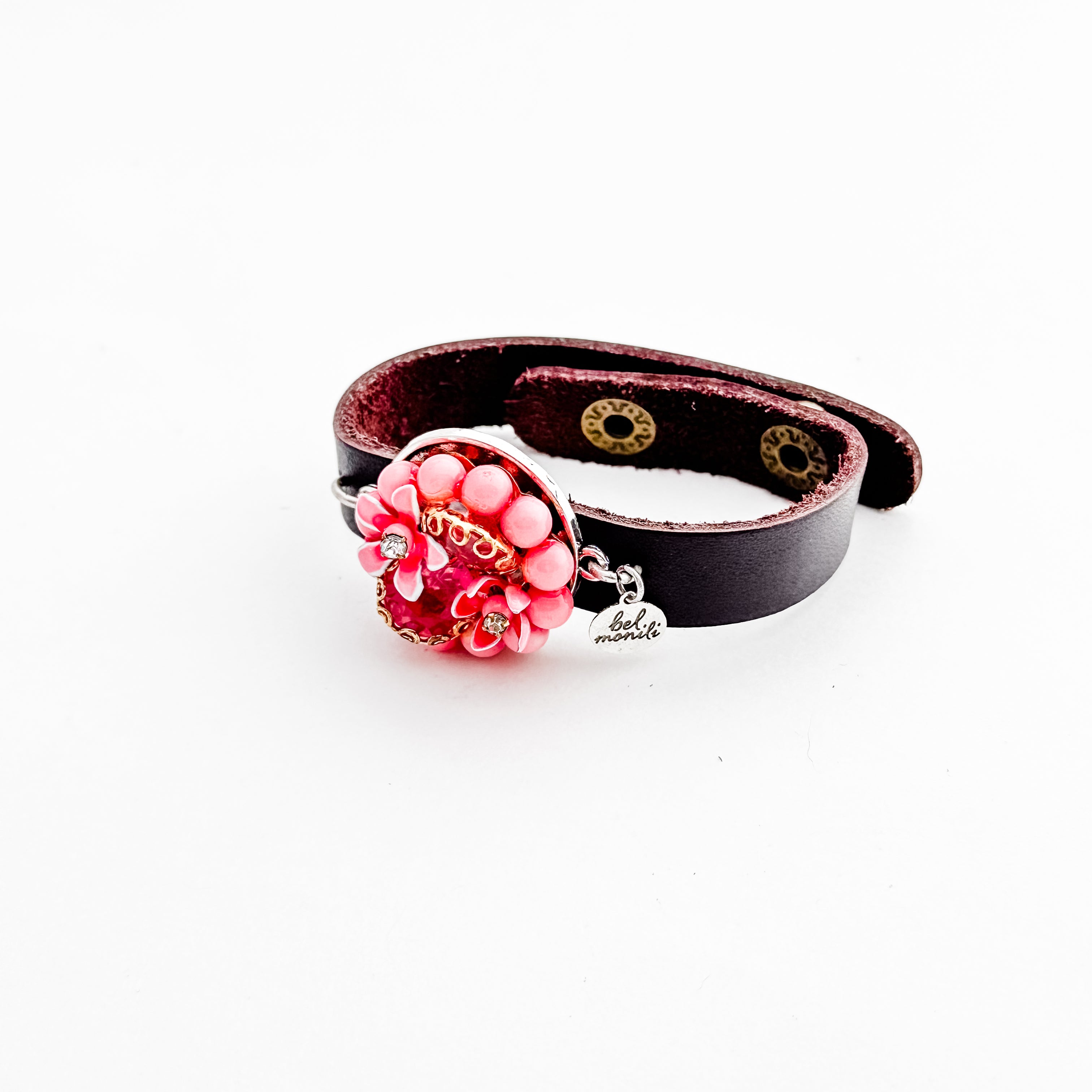 This snap cuff bracelet is a soft chocolate brown leather, featuring a vintage pink flower bauble earring as the central focal piece. This beautiful cuff is a one-of-a-kind stunner, so you can wear it with the confidence that it is as unique as you are.