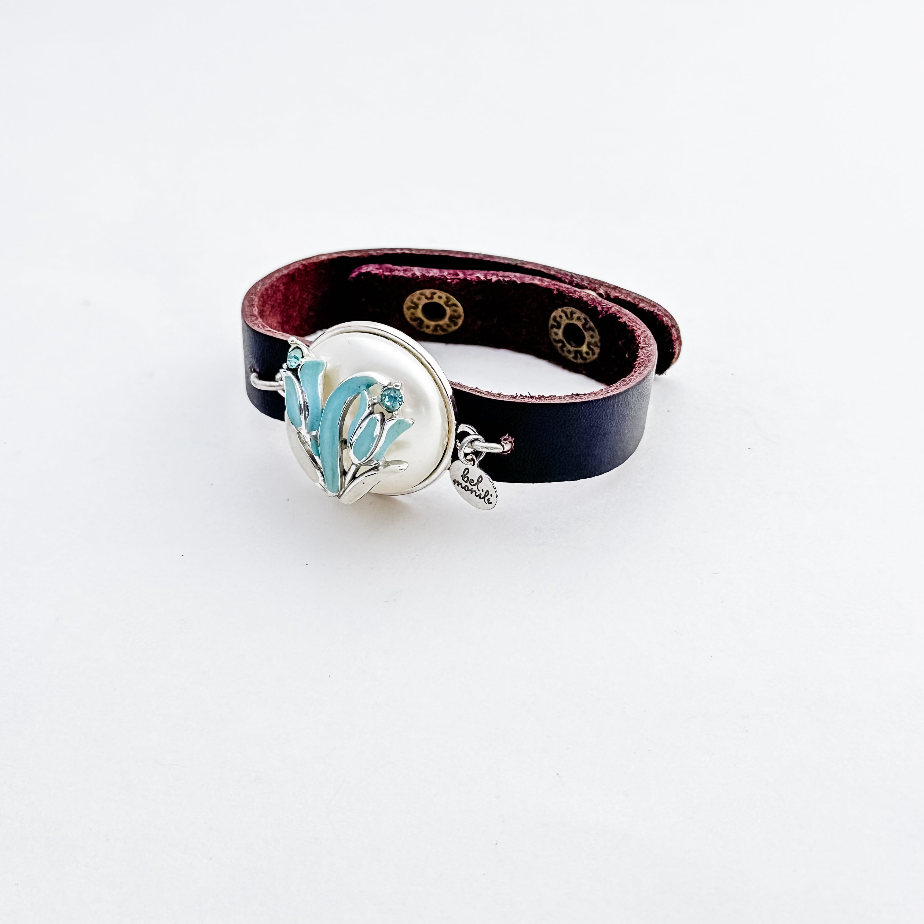 This snap cuff bracelet is a soft chocolate brown leather, featuring a vintage pearl earring as the central focal piece. This beautiful cuff is a one-of-a-kind stunner, so you can wear it with the confidence that it is as unique as you are.