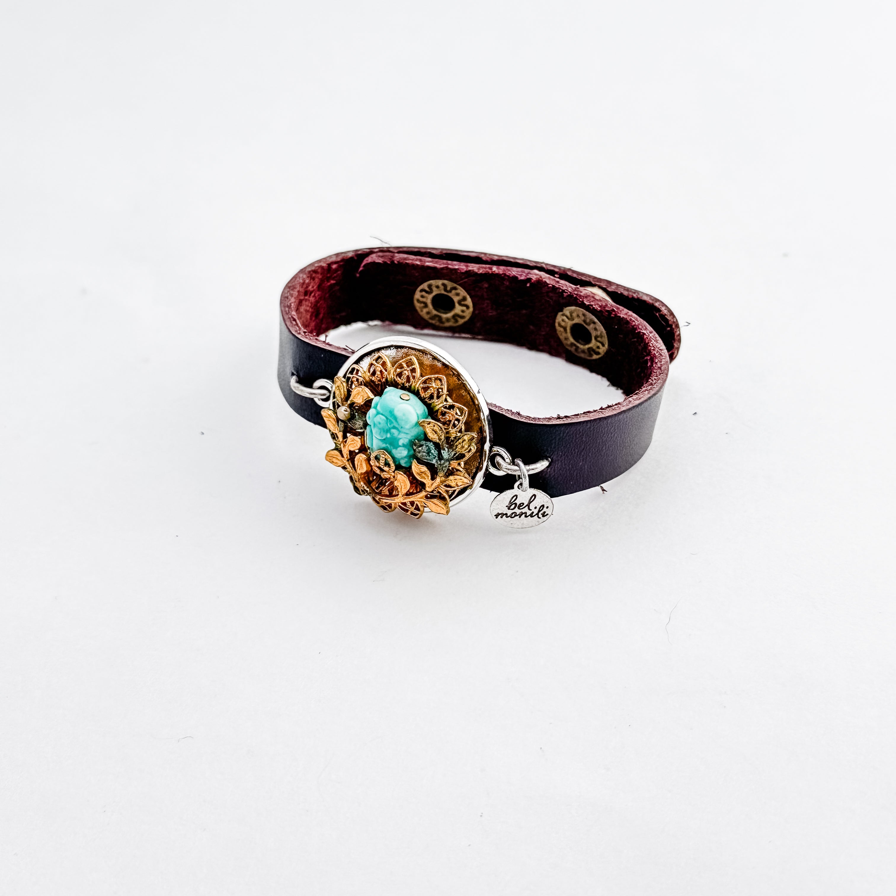 This snap cuff bracelet is a soft chocolate brown leather, featuring a vintage pearl earring as the central focal piece. This beautiful cuff is a one-of-a-kind stunner, so you can wear it with the confidence that it is as unique as you are.
