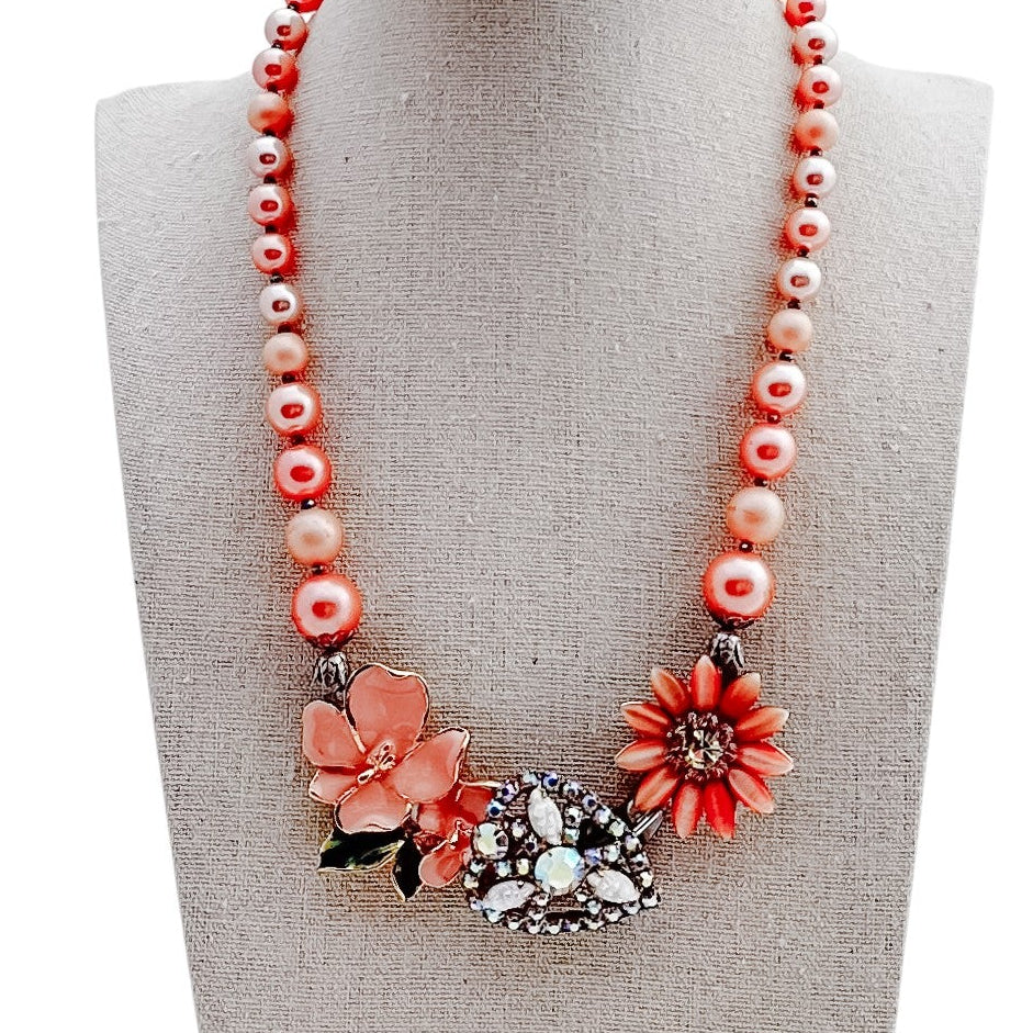 Here is one of my bel monili signature collage necklaces: a statement necklace that combines repurposed vintage costume jewelry components as the focal paired with hand-strung vintage resin beads.