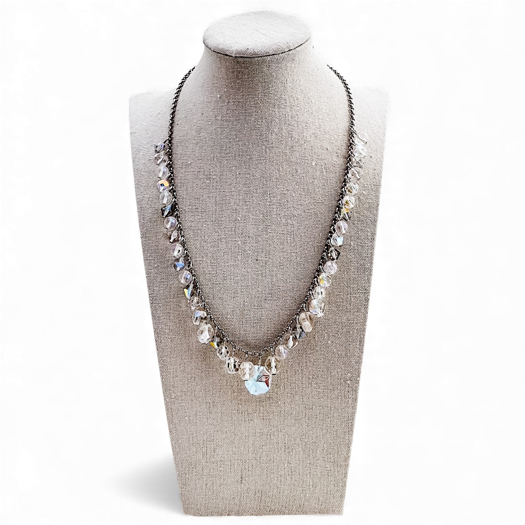 This stunning beaded necklace is a gorgeous statement piece composed of hand-wrapped mixed vintage crystal beads on a silver-plated rolo chain. This "cha-cha" style necklace softly moves with you, adding just the right amount of whimsy and interest to any outfit.